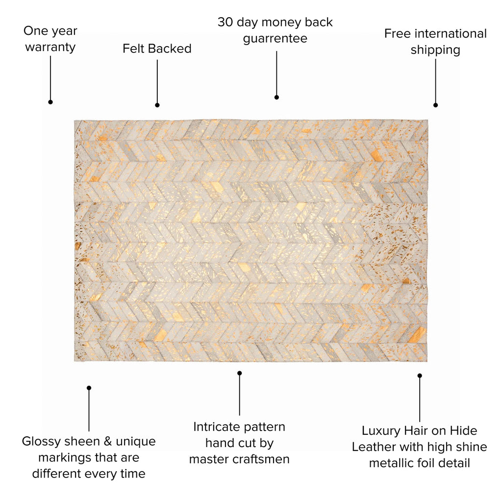 Introducing our Herringbone Cowhide Rug, handcrafted from natural cowhide and finished with a refined gold foil overlay. The iconic herringbone pattern paired with herritage materials and craftmanship adds understated luxury to any space.