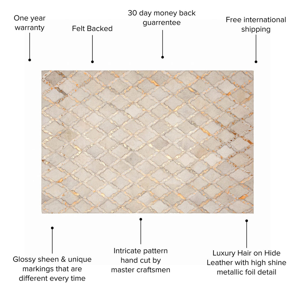 Introducing our Moroccan Style Geometric Rug, handcrafted from natural cowhide and finished with a refined gold foil overlay. Inspired by traditional Moroccan patterns, the geometric design brings texture, warmth and understated luxury to any interior.