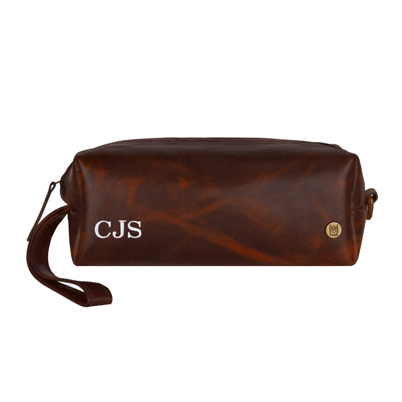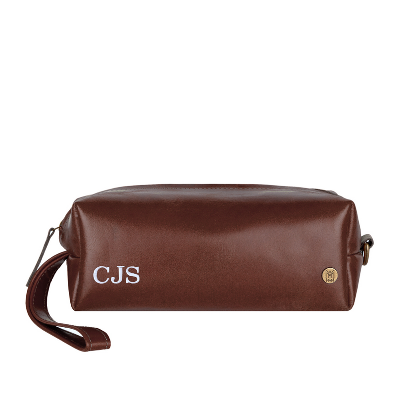 Our Classic Wash Bag, handmade with premium full grain leather and personalized with white cotton embroidery.