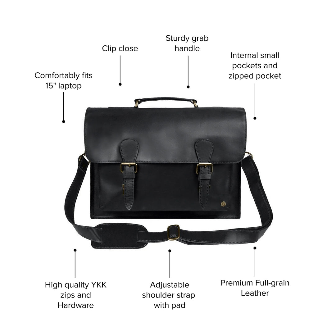 The classic Messenger in Ebony Black Leather makes for a stylish work, school or university bag, with ample space for your laptop, books and documents. Complete with a black cotton lining, our Messenger Satchel includes a zip pocket at the back, an internal zip pocket, a leather pouch style pockets at the front and an extendable detachable shoulder strap.