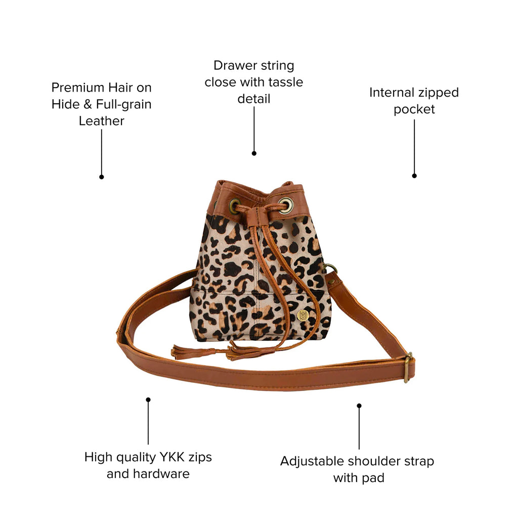 Styled on our Classic Bucket Bag, this mini counterpart in leopard print is the perfect pouch-style day bag for those looking for a cute accessory to hold their valuables and add a stylish touch to any outfit. Made with leopard print cowhide with a natural 'pony hair' finish and buttery-soft Vintage Brown leather detail, features include decorative brass eyelets, a robust leather drawstring and an interior zip pocket within the main compartment. Great for festival-goers and urbanites alike.