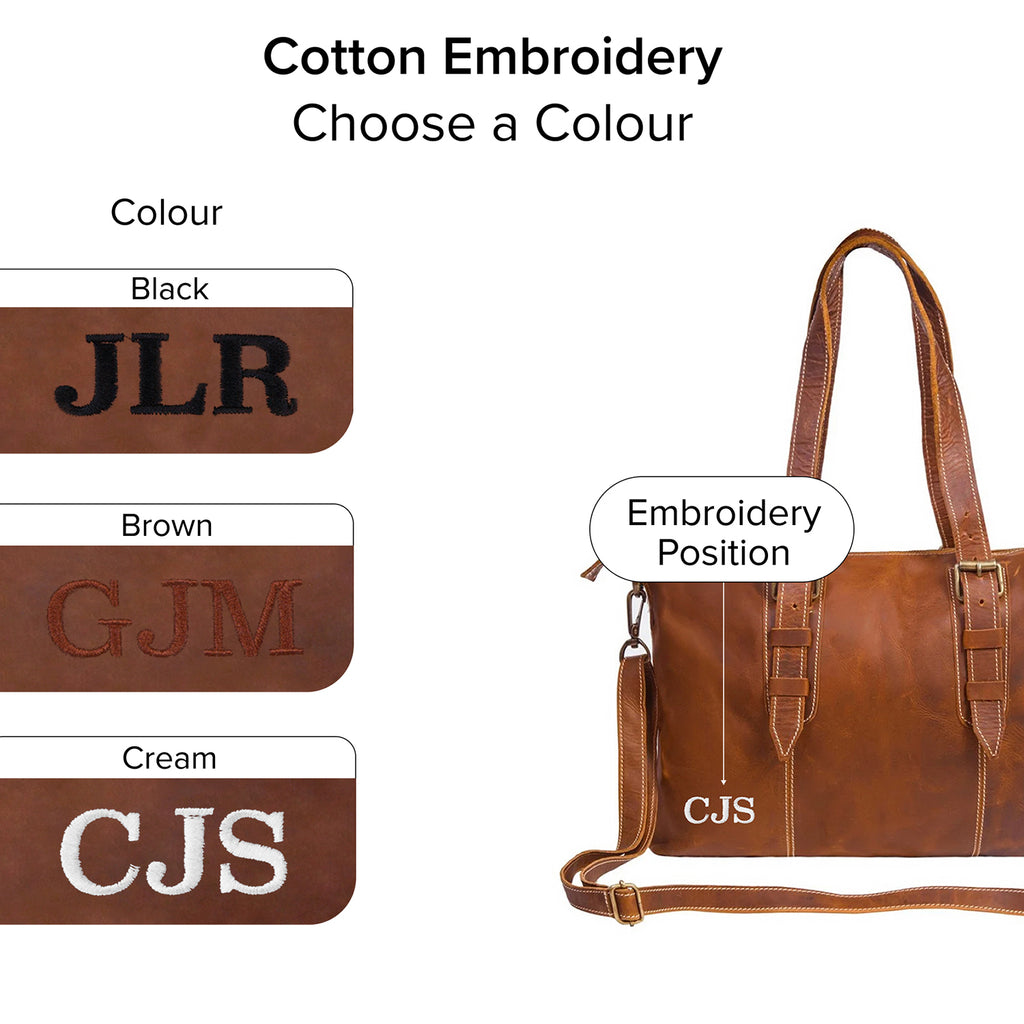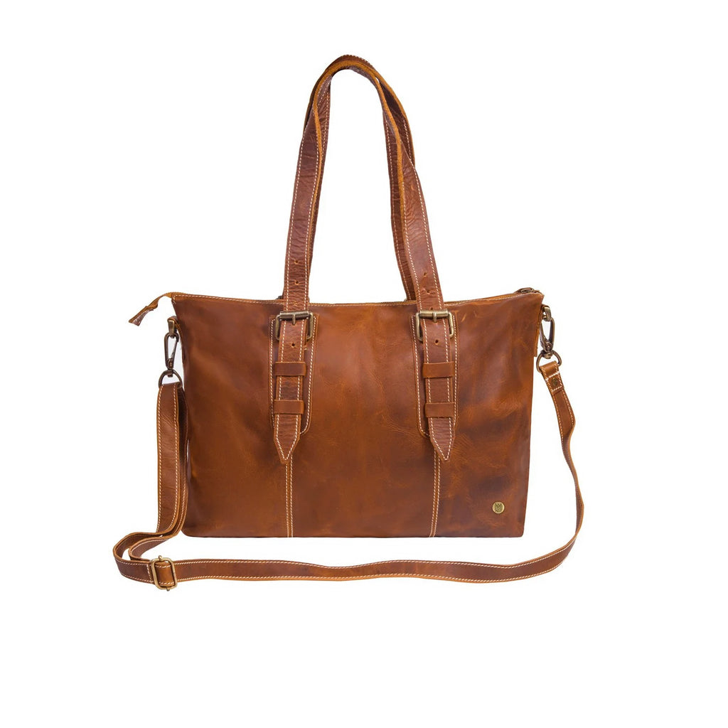 The Victoria Strapped Tote in our flagship Vintage Brown Leather with elegant cream stitching detail is a practical everyday handbag or work bag with 13" laptop capacity.
