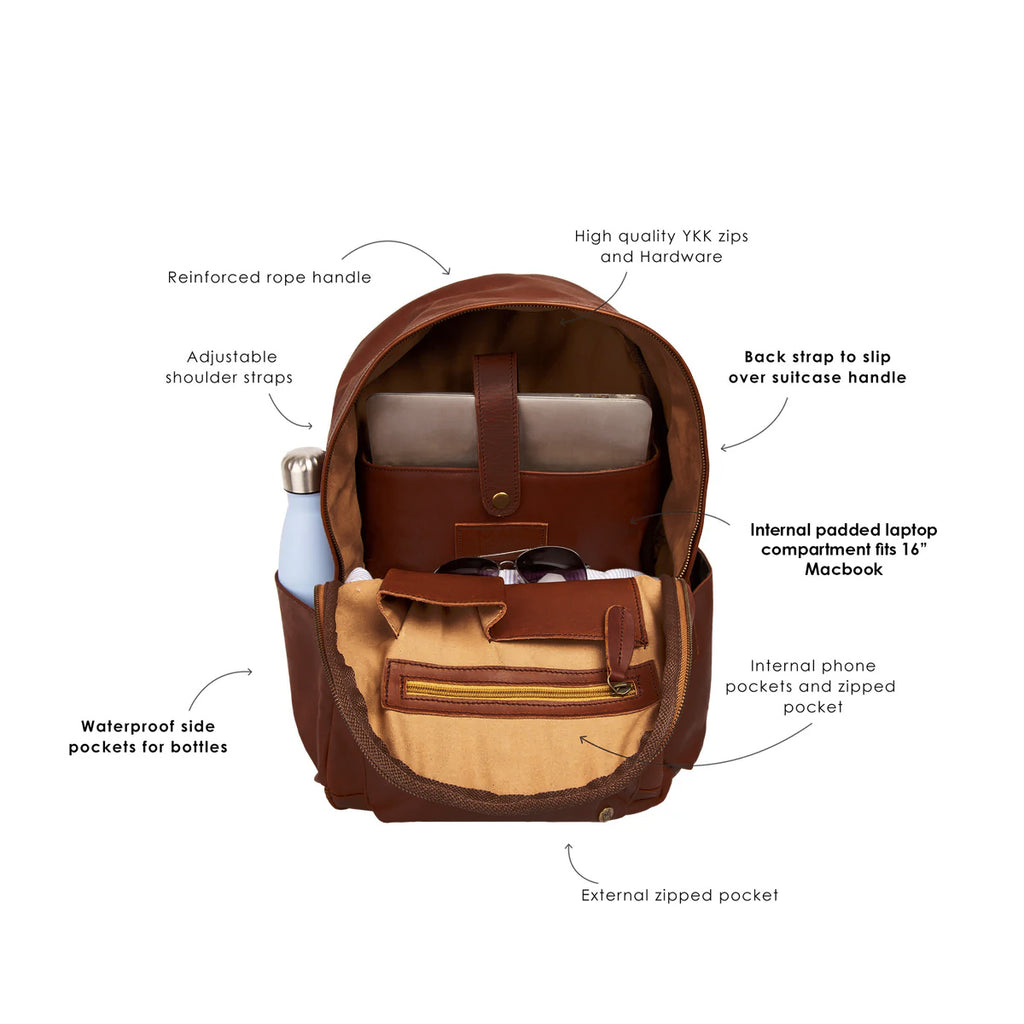 Our re-designed Classic Backpack now has ample space for a 16" MacBook, and we've even given it its own padded laptop compartment so you can stay organised. We've also added two external water bottle holders, complete with waterproof lining, and a handy leather strap on the back that slots over wheelie suitcase handles so you can give your back a rest when you're on the go.